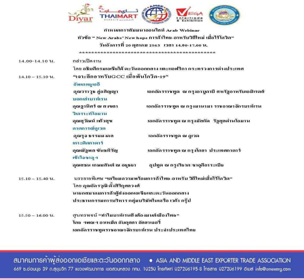 งานสัมมนาออนไลน์ ที่มีการเชิญเอกอัครราชทูตจาก 6ประเทศ ไม่ว่าจะเป็น การ์ตา, บาห์เรน, ซาอุดิอาระเบีย, โอมาน, คูเวต และยูเออี ที่จะมาให้ความรู้เกี่ยวกับการค้าและความต้องการของการบริโภคสินค้าที่ประเทศไทยมีโอกาสในการตอบสนองหรือทดแทนในตลาดได้ ทั้งนี้ยังชี้ช่องทางในการสนับสนุนจากทางสถานทูตกับผู้ประกอบการทุกท่าน และยังมีการเชิญผู้ประกอบการที่มีประสบการณ์การค้าในตะวันออกกลางมาร่วมเสวนาตอบคำตอบกับผู้เข้าร่วมอีกด้วย